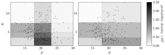 Figure10 shows the discretization policy for variables and obtained with the Bayesian method. The discretization edge also appears in both discretization policies from the fixed network (Figure8). This suggests that discretization edges can be robust against network structure. Furthermore, the discretization edge at in the fixed-structure case is missing in the learned structure. This is caused by having twice as many parents in the learned network structure. The more parents a variable has, the fewer discretization intervals it can to support, as the number of sufficient statistics required to define the resulting distribution increases exponentially with the number of parents.