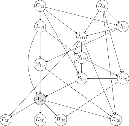 This section describes experiments conducted to evaluate the Bayesian discretization method. All experiments were run on datasets from the publically available University of California, Irvine machine learning repository (Lichman 2013). Variables are labeled alphabetically in the order given on the dataset information webpage. In the figures that follow, shaded nodes correspond to initially discrete variables and the subscripts indicate the number of discrete instantiations.