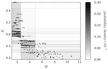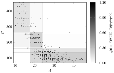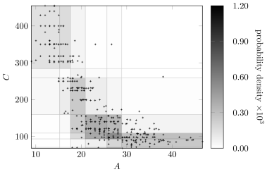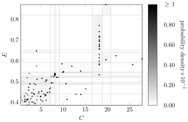 Figures12 and 13 show the discretization policy learned using the Bayesian approach on the fixed network shown in Figure11. The scatter points in Figure12 were jittered to show the quantity of repeated values for variables and . Each repeated point forms a single discrete region, thereby encouraging discretization. In contrast, the samples for are well spread out, resulting in fewer discretization regions and larger discretization intervals.