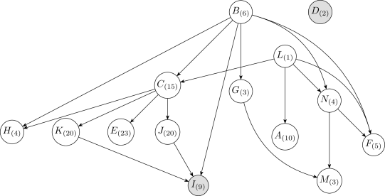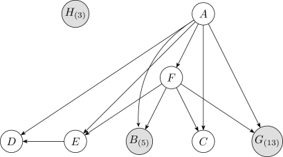 Figure14 shows a learned Bayesian network structure and the corresponding numbers of intervals after discretization for each continuous variable. Variable is neighborless in both the learned and fixed networks. The continuous variables , , and , which are all connected through , have many discretization intervals. Typically, when discretizing a variable, the expected number of discretization intervals is close to the highest cardinality among variables in its Markov blanket. This naturally leads to clusters of variables with many discretization intervals.