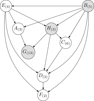 After the initial discretization, the one-variable discretization method is iteratively applied over each continuous variable in reverse topoligical order, from the leaves to the root. Reverse topological order has the advantage of relying on fewer initial discretizations of the continuous variables during the first pass. For example, in the network of Figure2, if is the only discrete variable, then the discretization of involves both and , whereas the discretization of only involves .